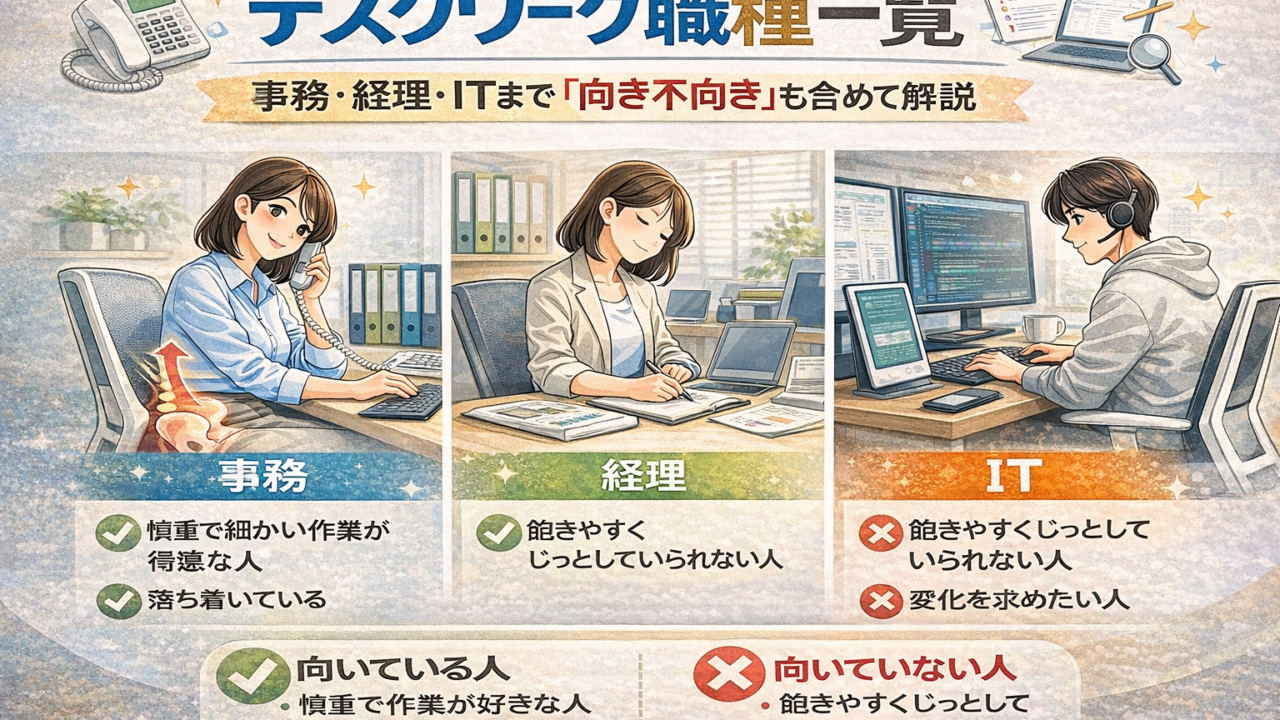 この記事では代表的なデスクワーク職種を一覧で整理し、それぞれの特徴と「向き不向き」の考え方、未経験で選ぶときの見方まで分かりやすくまとめます。