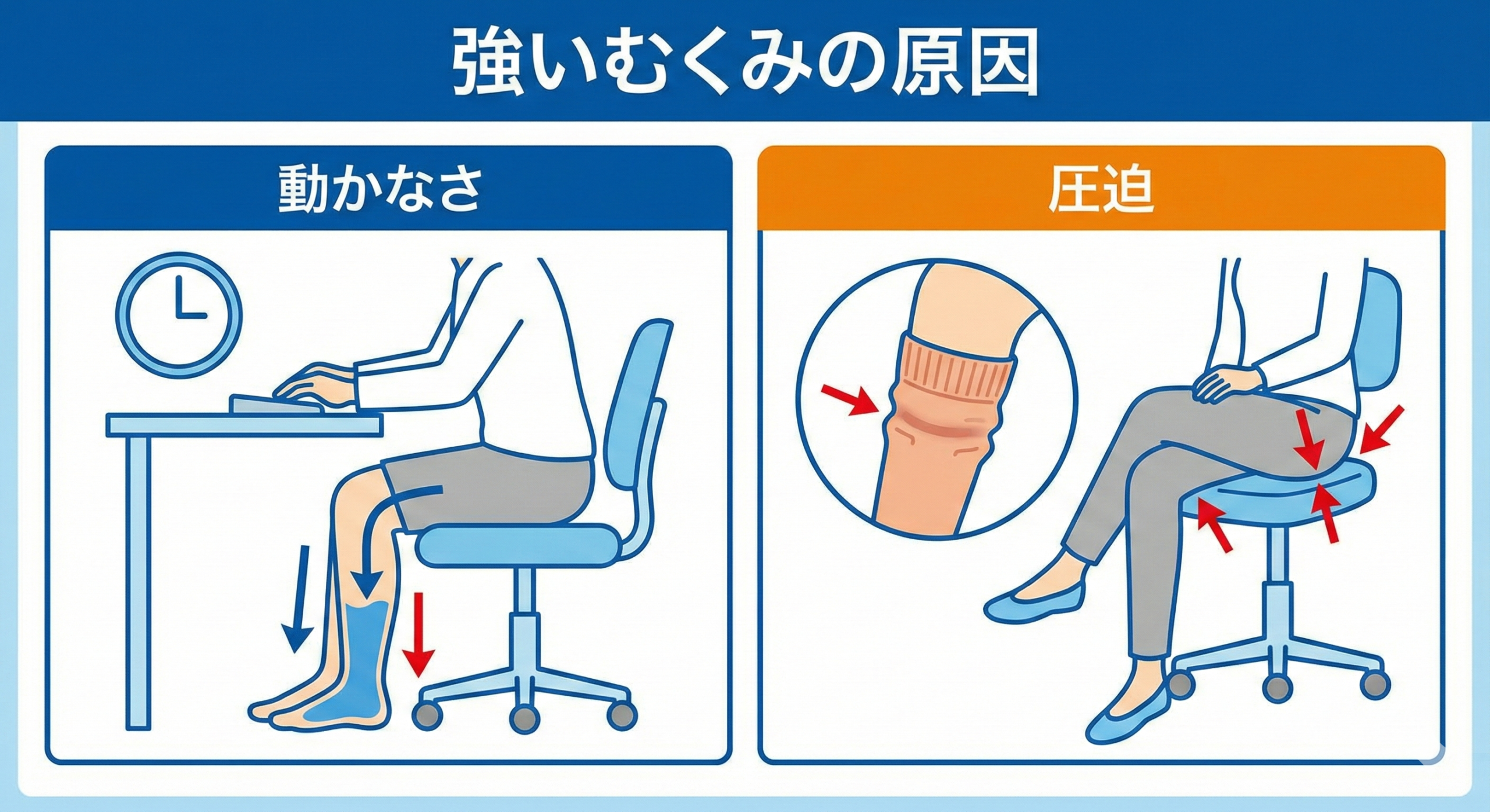 デスクワーク足のむくみひどい原因|強いむくみは“圧迫+動かなさ”が増えやすい