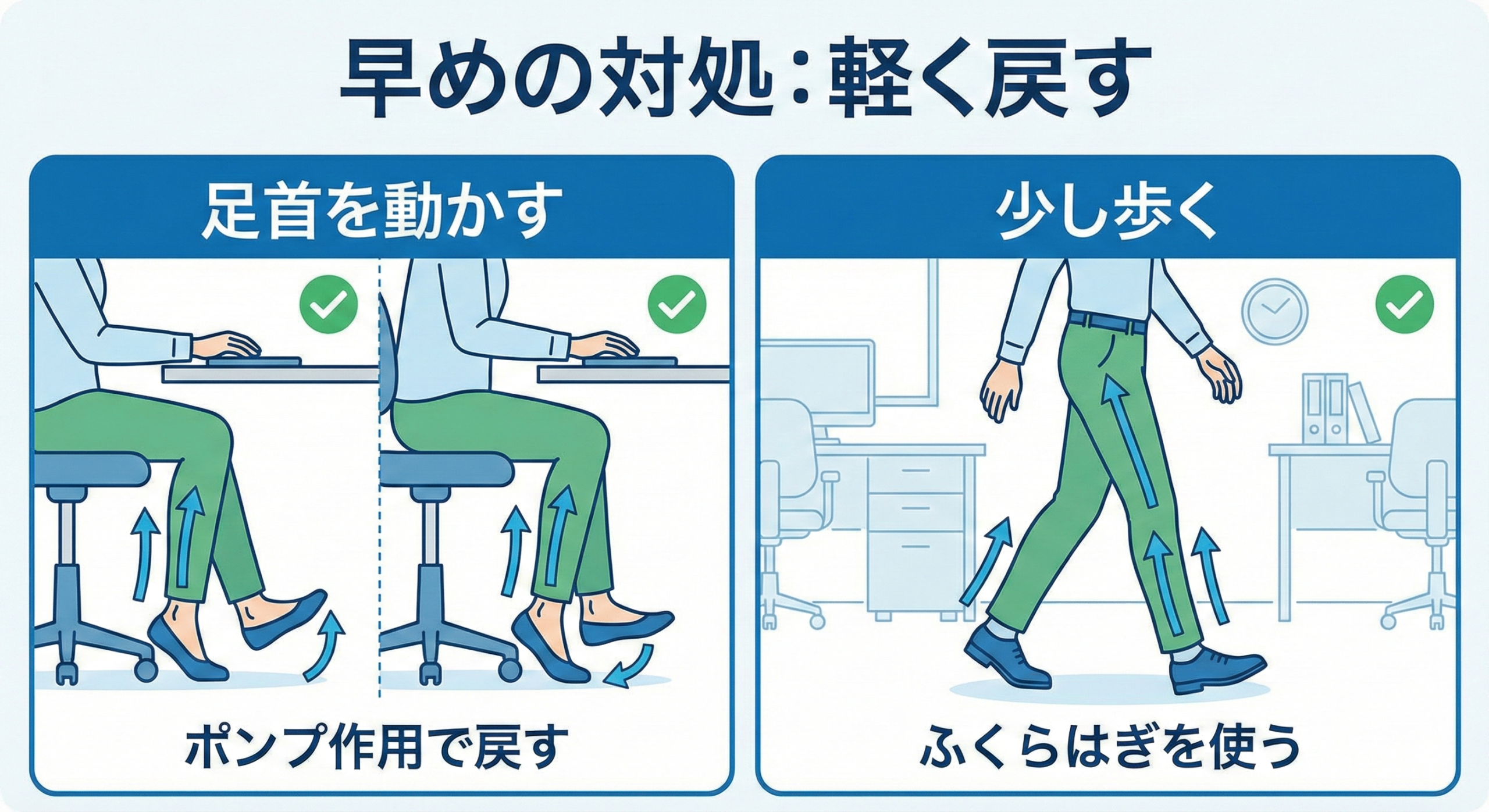 もし席を立てる状況であれば、数分間だけでも歩くことが最も強力な解決策になります。