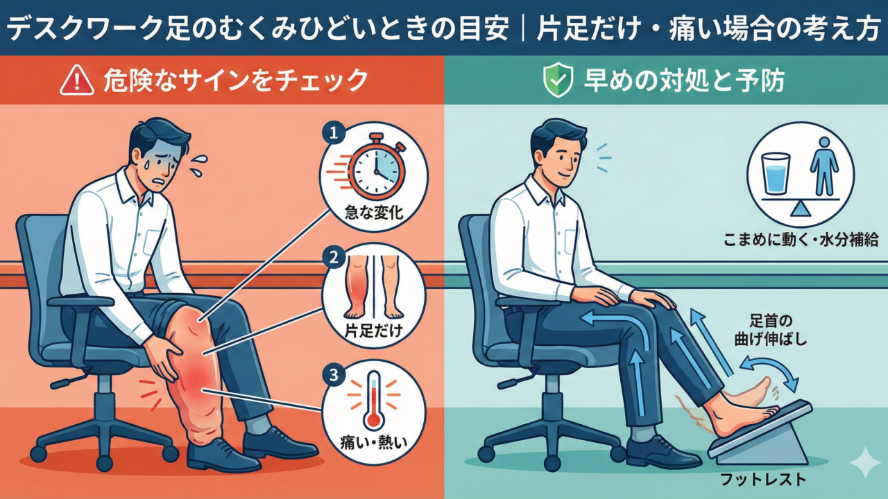 デスクワーク足のむくみひどいまとめ|迷ったら「急な変化・片足・痛い熱い」を先に確認