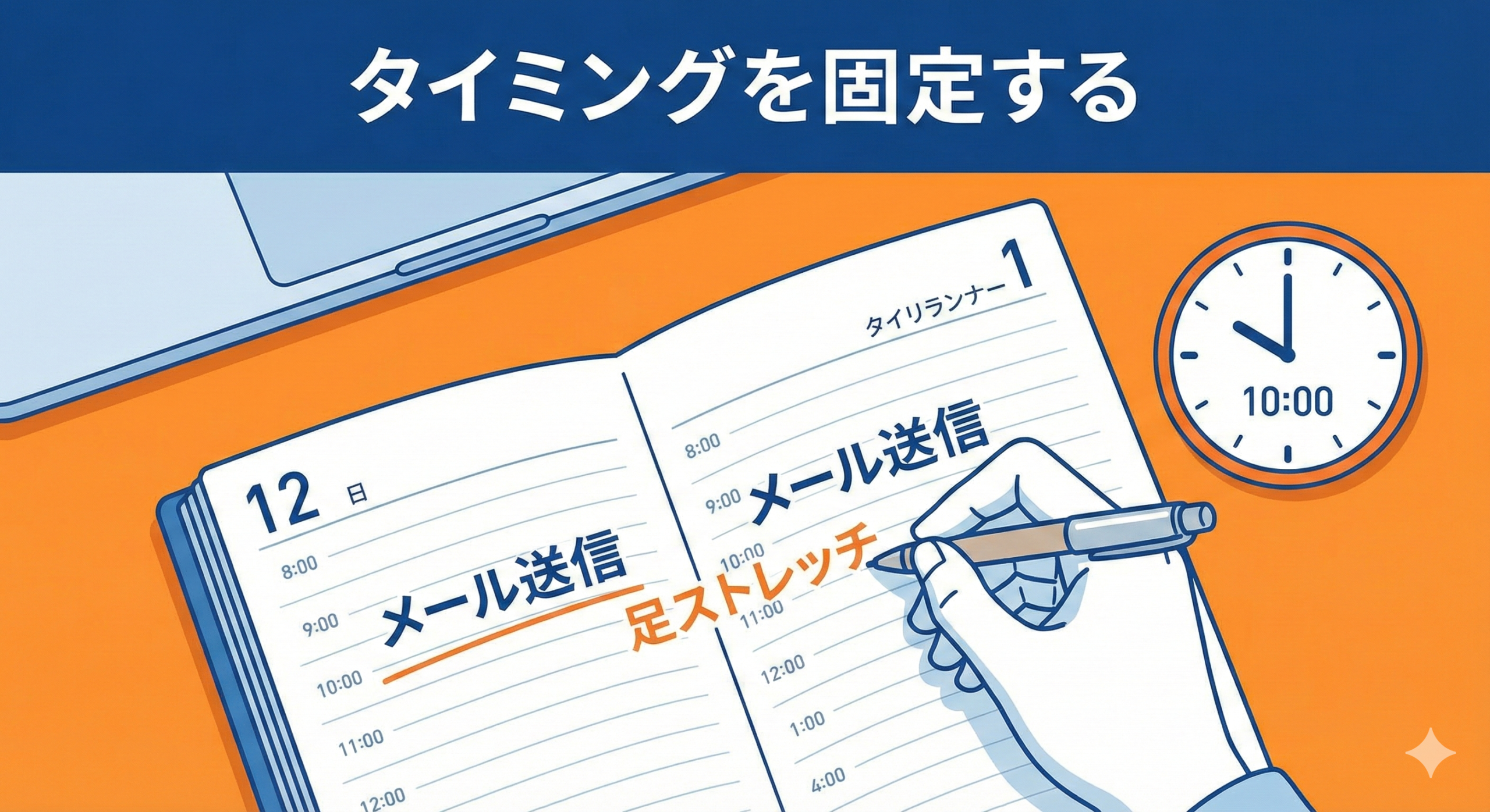 このように「AをしたらBをする」とセットで決めておけば、1分のストレッチが仕事の一部になります。