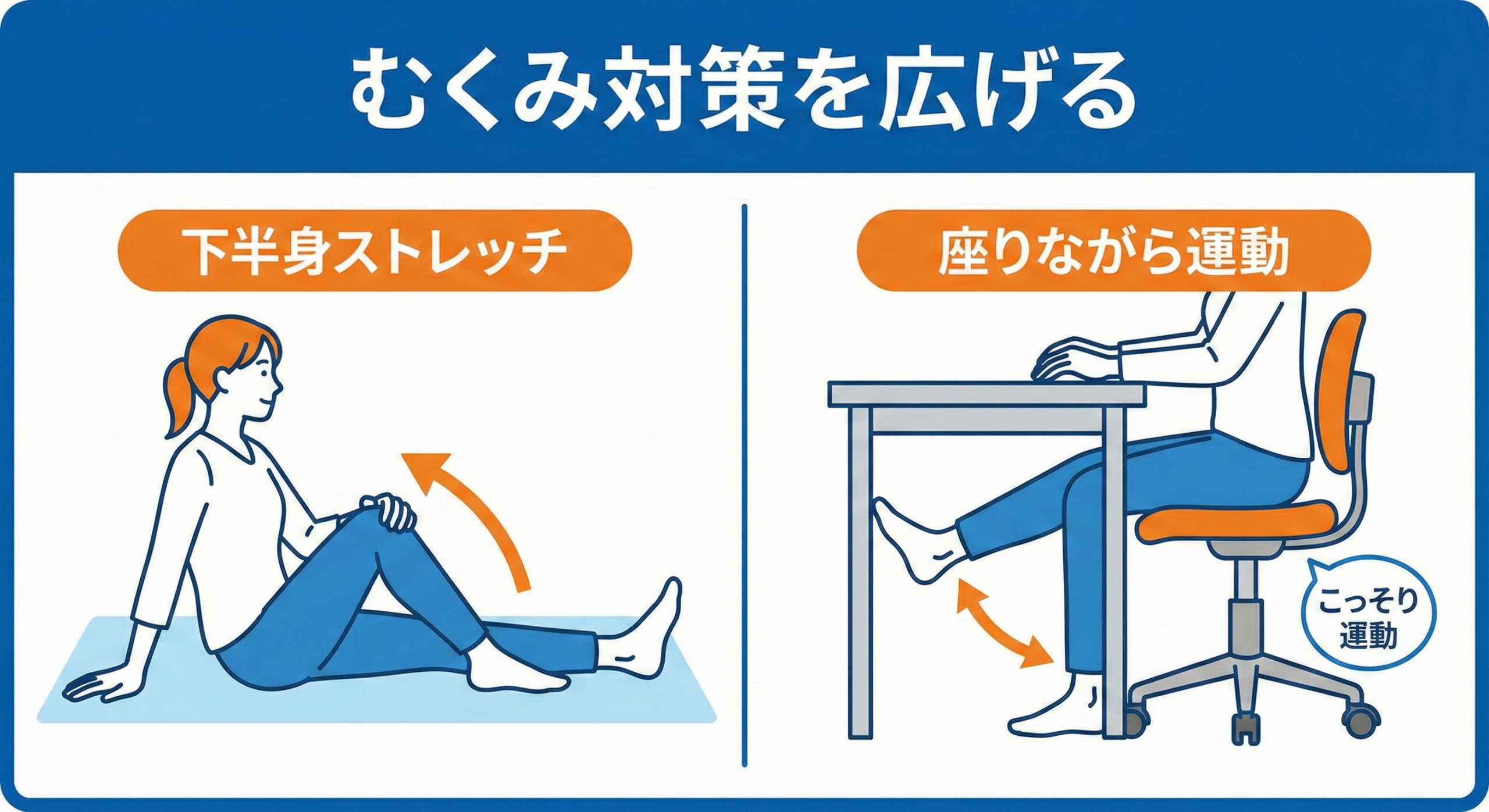 下半身ストレッチや座りながら運動と組み合わせる|むくみ対策を“広げる”