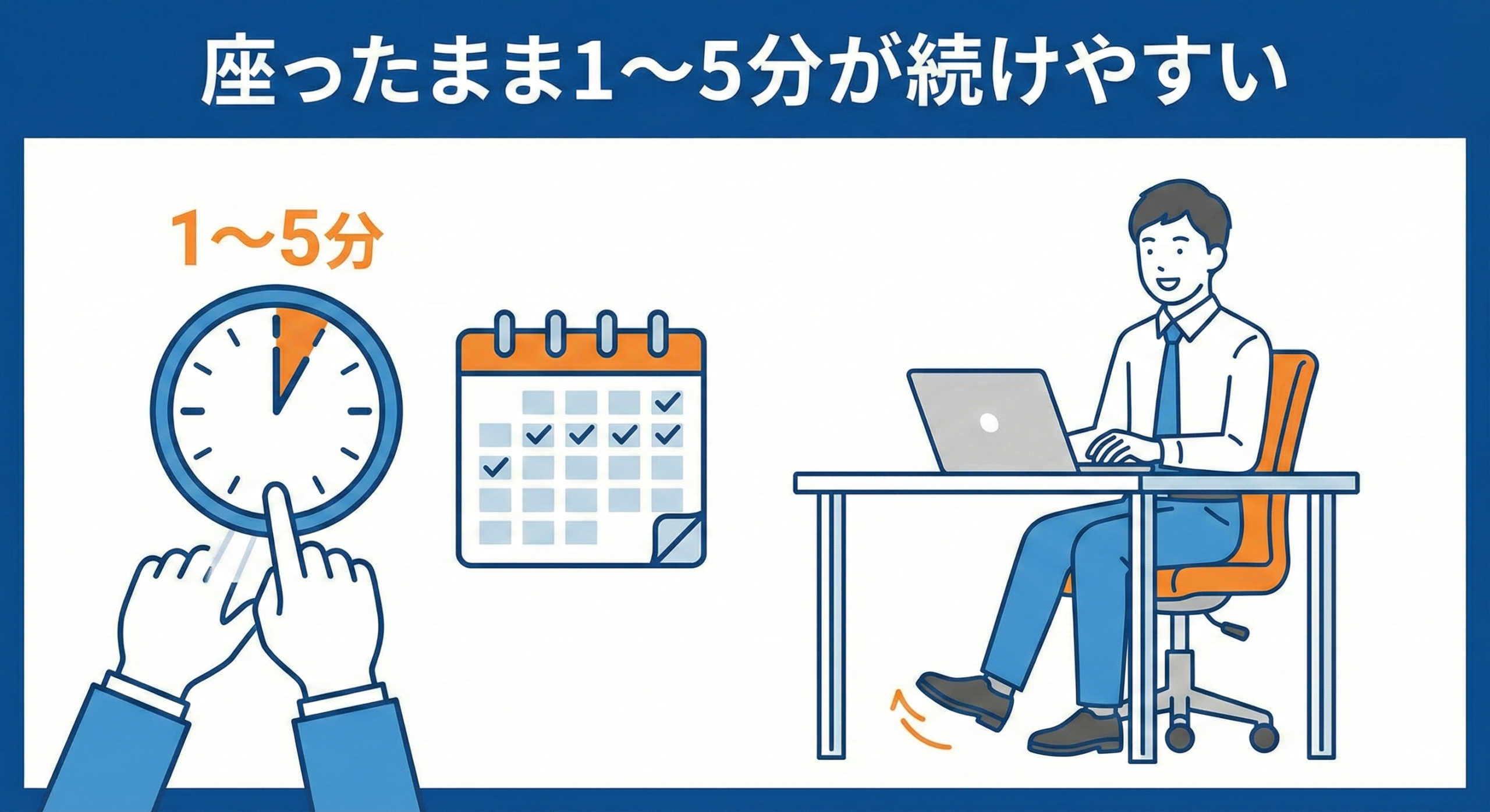 大切なのは、座ったまま「1分〜5分」で終わる小さな動きをこまめに繰り返すことです。