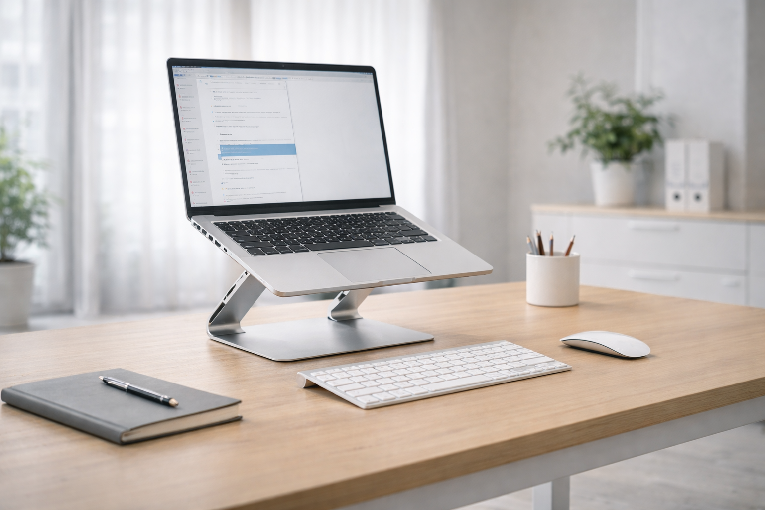 PCスタンドで画面が上がると、覗き込む必要が減って前傾姿勢が減りやすくなり、首や肩がラクに感じる人も多いです。